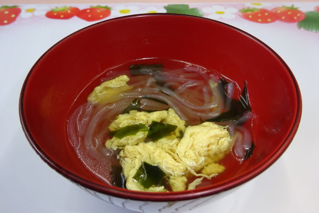 そぼろちらし寿司、かぼちゃとブロッコリーのサラダ、わかめと春雨のすまし汁、オレンジでした。